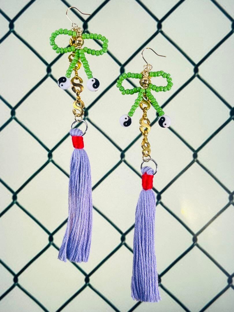ハンドメイド グリーン リボン ビーズ タッセル チェーン チャイナ風 ピアス