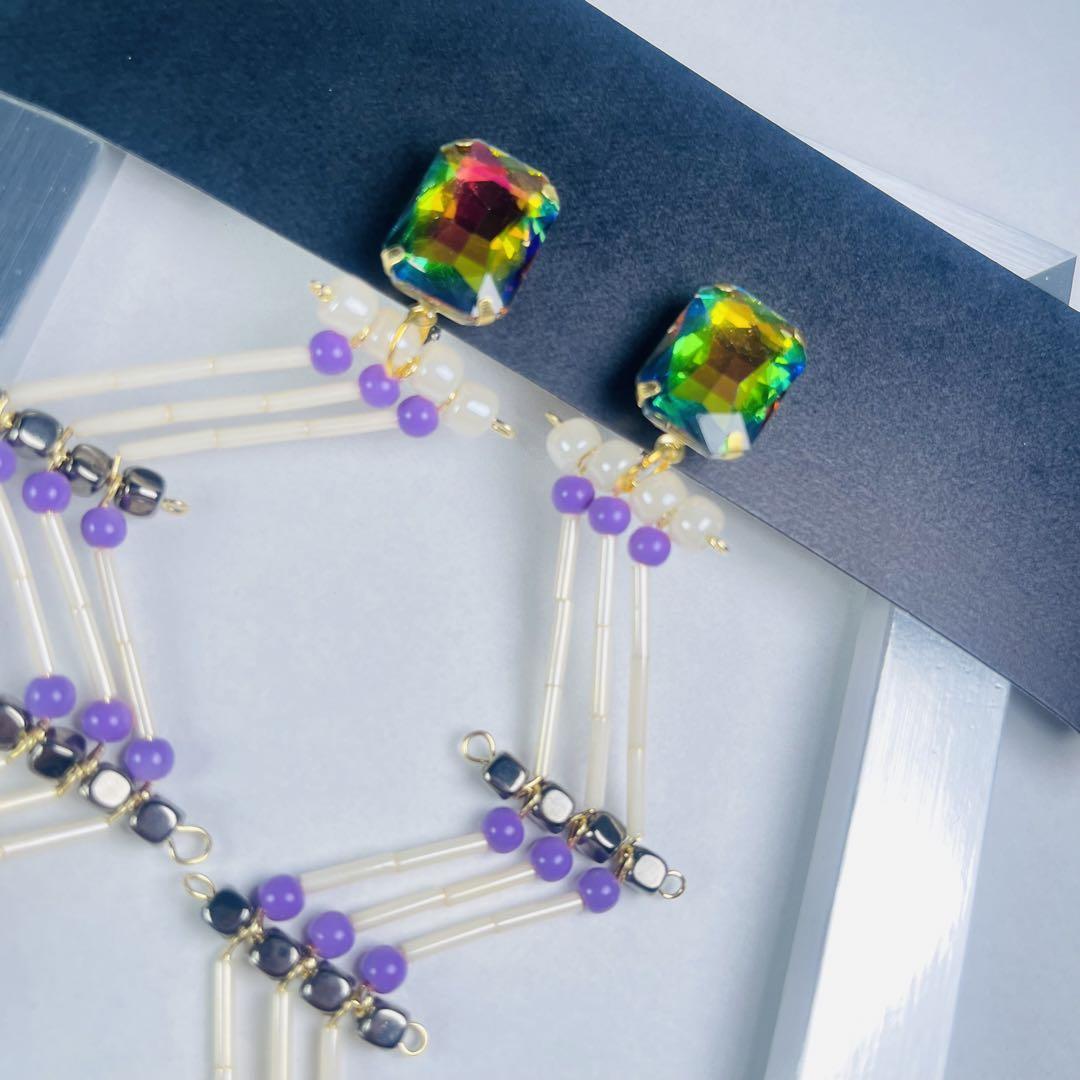 ハンドメイド ホワイト ギザギザ ビジュー イヤリング