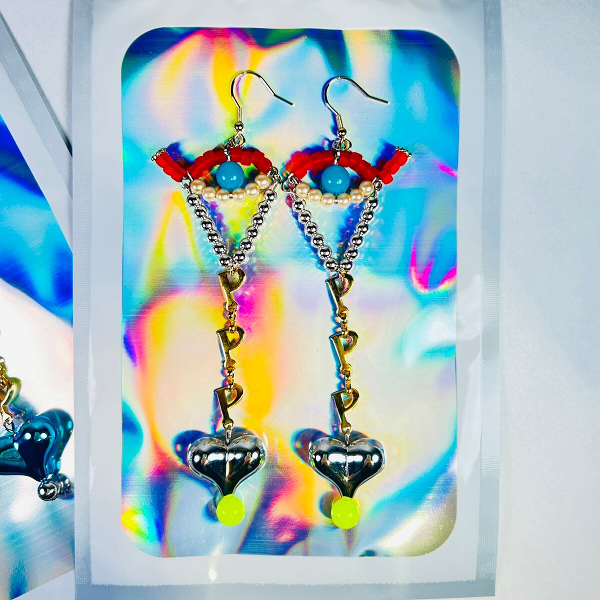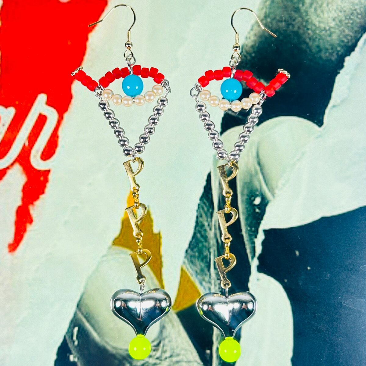 ハンドメイド レッドライン ブルーアイ シルバーハート 両耳用ピアス