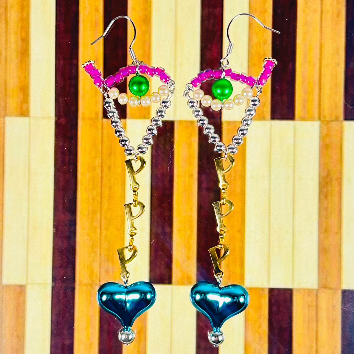 ハンドメイド パープルライン グリーンアイ ブルーハート 両耳用ピアス